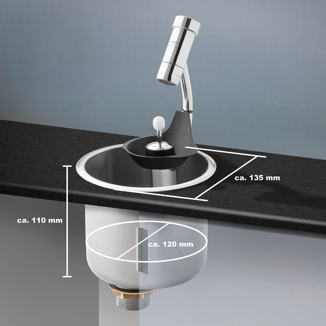 Integrated water-jet adjustment on the upper shower head – The water jet from below will be as strong as possible in order to ensure a maximum rinsing result with regard to the messy inner bowl of the scoop. The water flow from above can be adjusted avoid excessive water splashing around while still achieving a good rinsing result from outside.