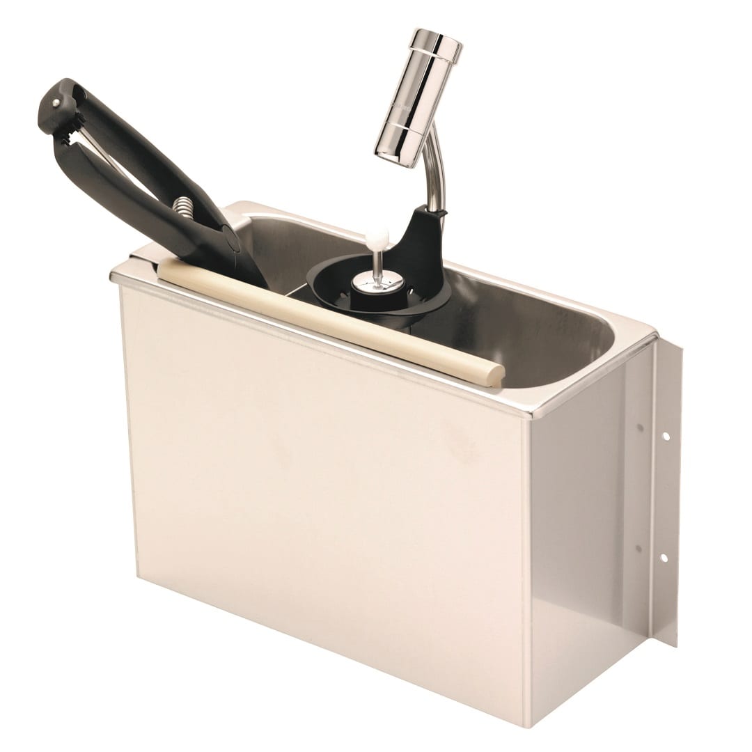 Removable scoop drain insert –ย The scoop drain insert can be easily clipped into the rinsing containers and serves as a clean drip drain area for rinsed scoops while keeping sufficient distance from the bottom of the rinsing container. This allows air to circulate, reducing bacterial growth, maximising hygiene.