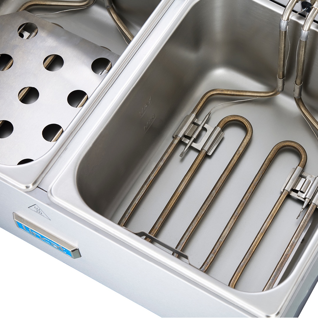 Each of the two 5-litre tanks operates independently, powered by its own 2.8 kW element and 13 A plug connection, allowing full control over temperature and operation. Perfect for frying chips and fish at the same time or managing vegetarian and meat options separately.