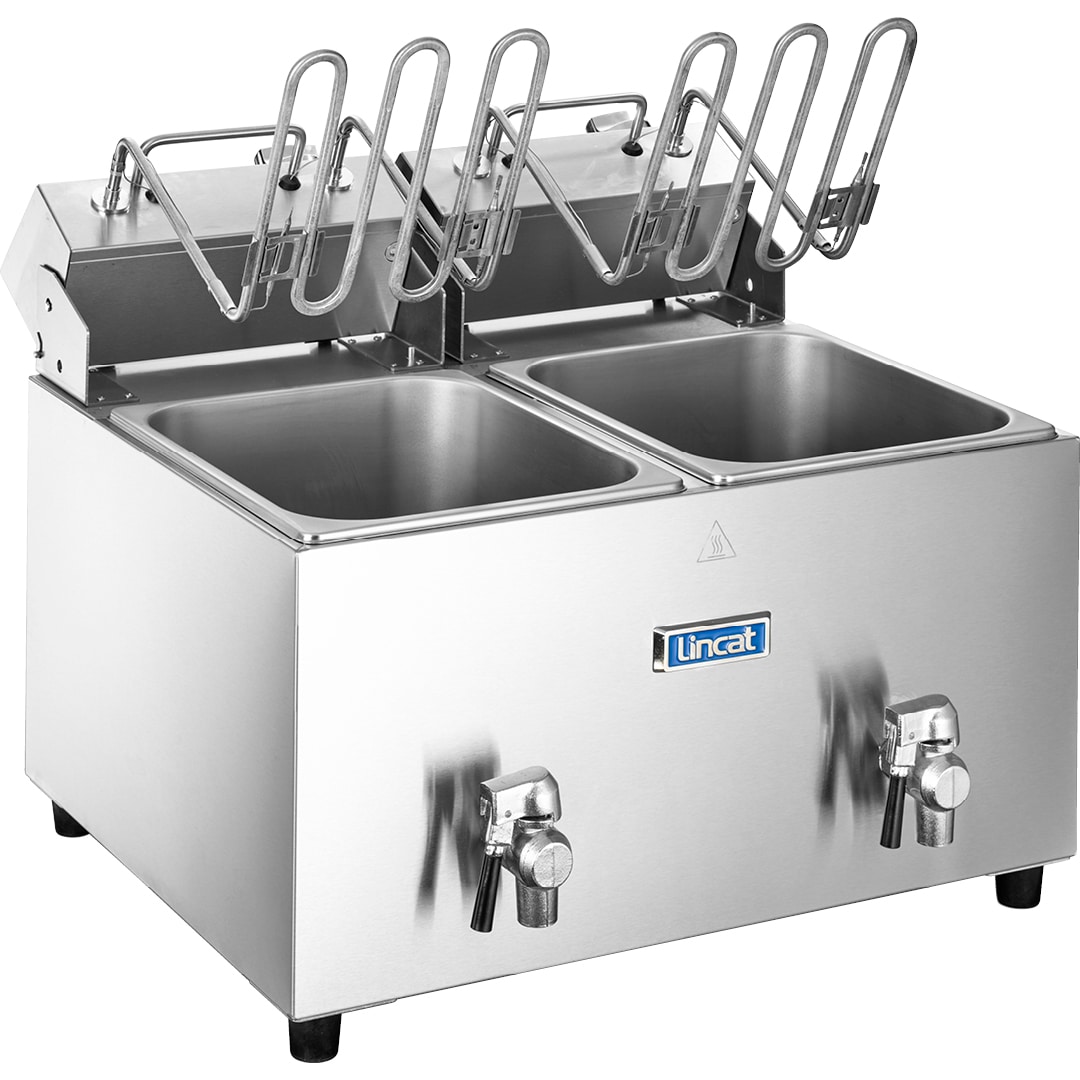 Cleaning is quick and safe thanks to the front-mounted oil drain taps, hinged heating elements, and V-shaped tanks that promote full oil drainage. The stainless-steel body and supplied lids make it durable, hygienic, and easy to maintain between services.