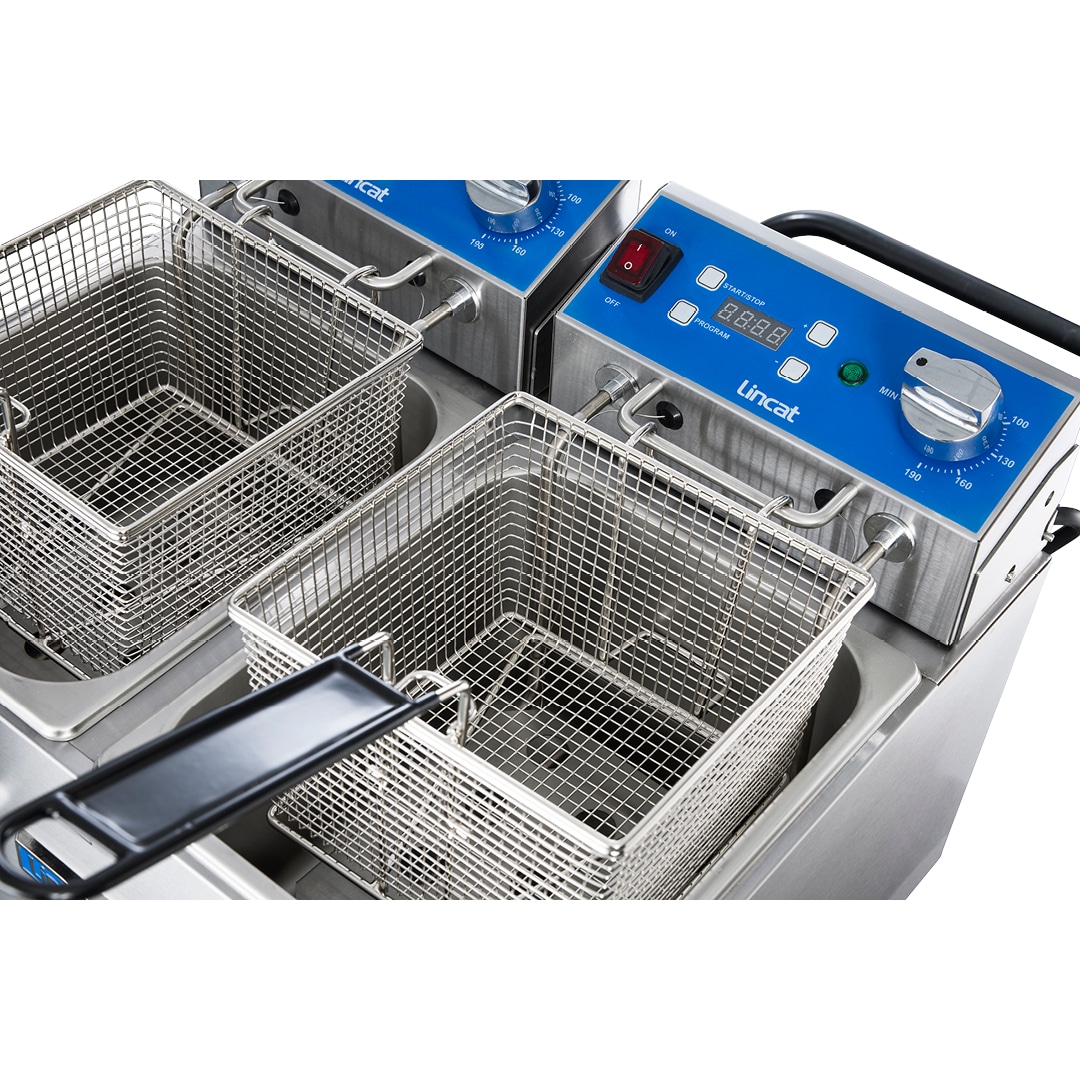 Each 8 L tank operates independently with its own 2.9 kW heating element, rotary thermostat, and digital timer with audible alarm — ensuring consistent, repeatable results for chips, seafood, desserts, and more. Fast heat-up and recovery times mean the LPDF2T can handle busy service periods with ease, even when frying from frozen.