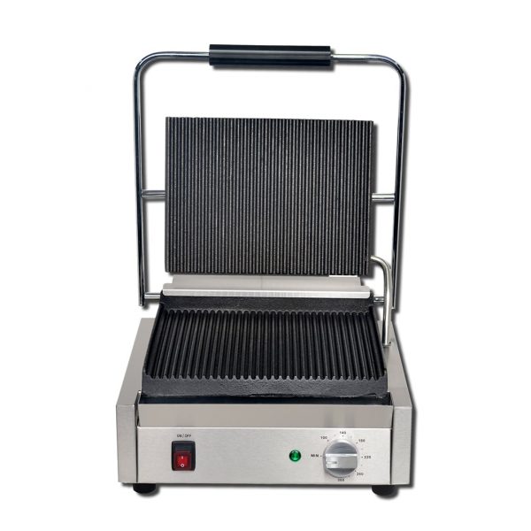 Mercury Single Ribbed Contact Grill – 2.2kW Compact countertop contact/panini grill with grooved plates top and bottom. Cooking area: 300 x 226 mm Operating temperature: 100-300°C 2.2kW – 13amp plug fitted