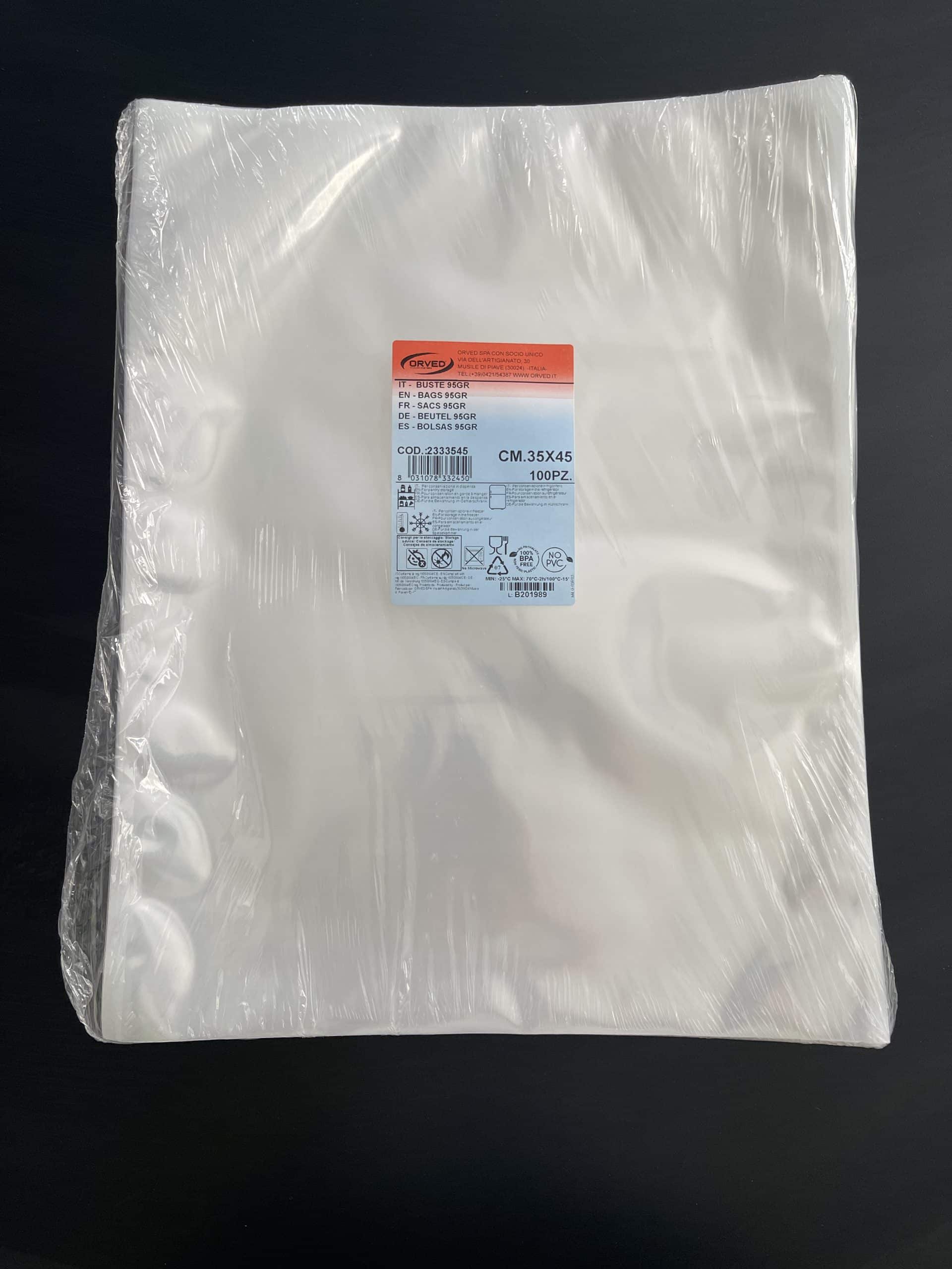 350 x 450 mm Smooth Vacuum Packing Bags for Food Preservation and Storage. Ideal for storage in: Refrigerators, Freezers & Pantry Can be used in all chamber style vacuum pack machines 100% BPA FREE – NO PVC Not designed for Sous Vide or Microwave Cooking Orved Code: 2333545 Sold in packs of 100 bags
